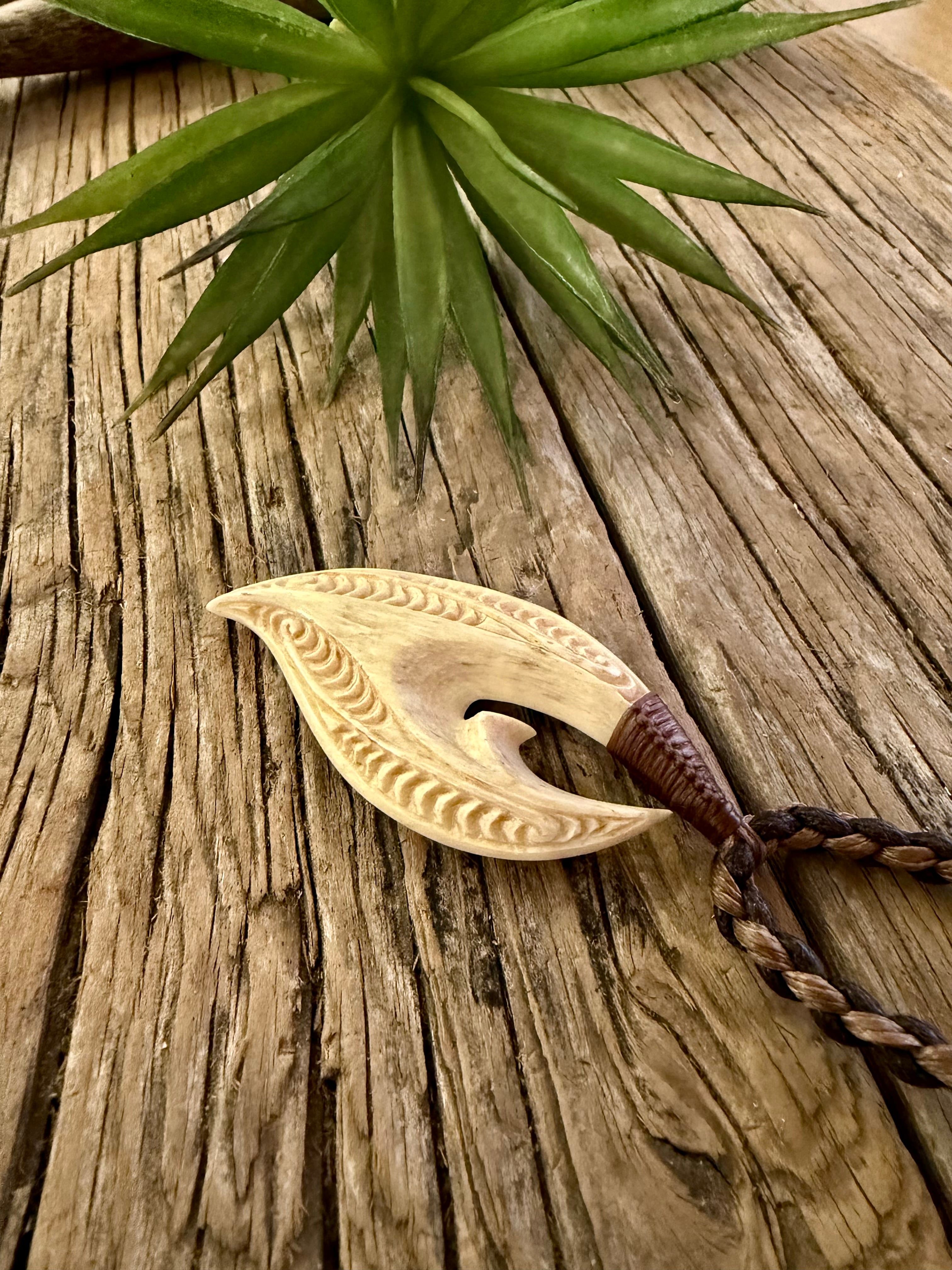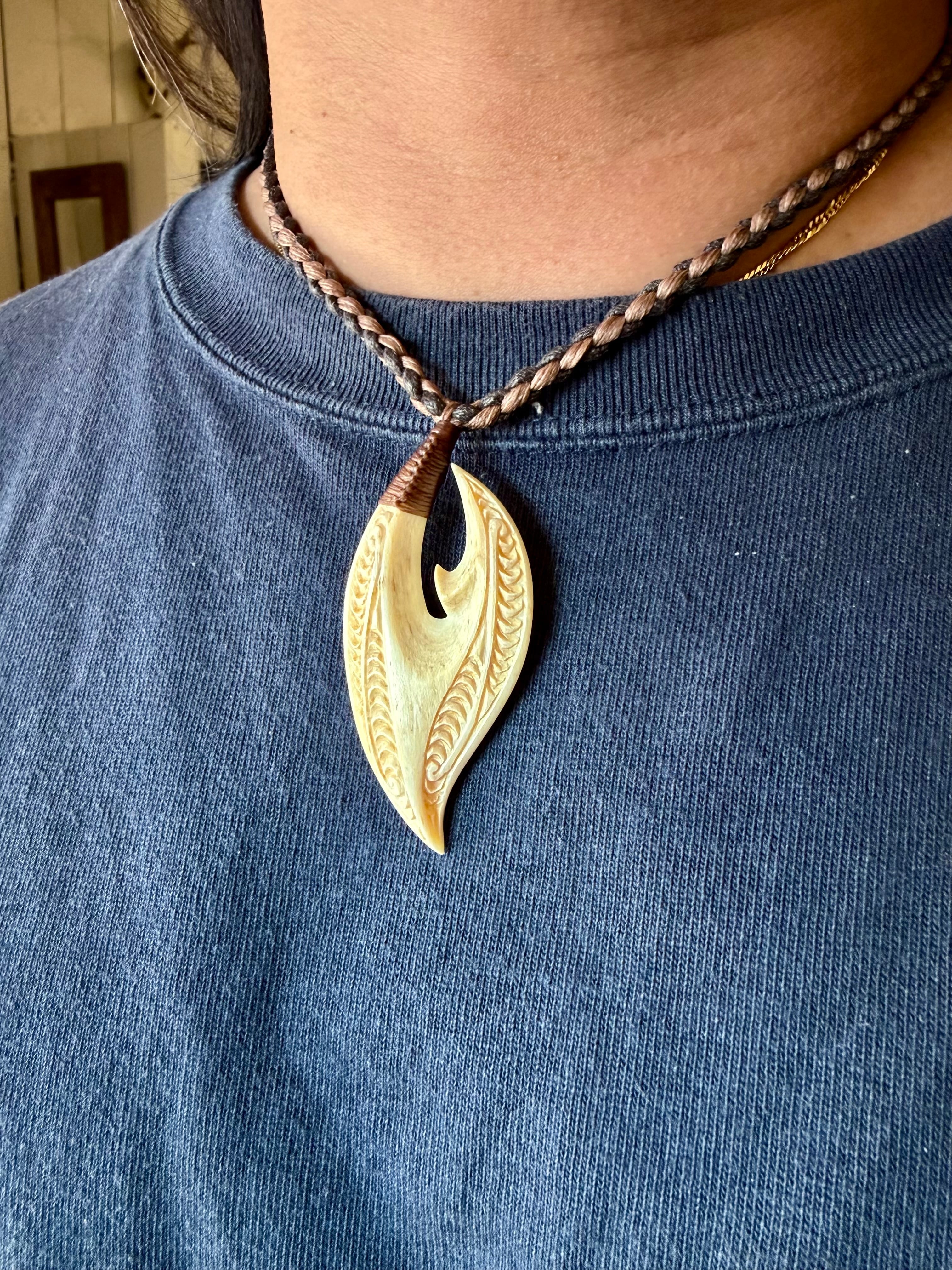 マッコウクジラならではの独特な斑点と色合いを活かしながら、トライバルを彫り込んであります。