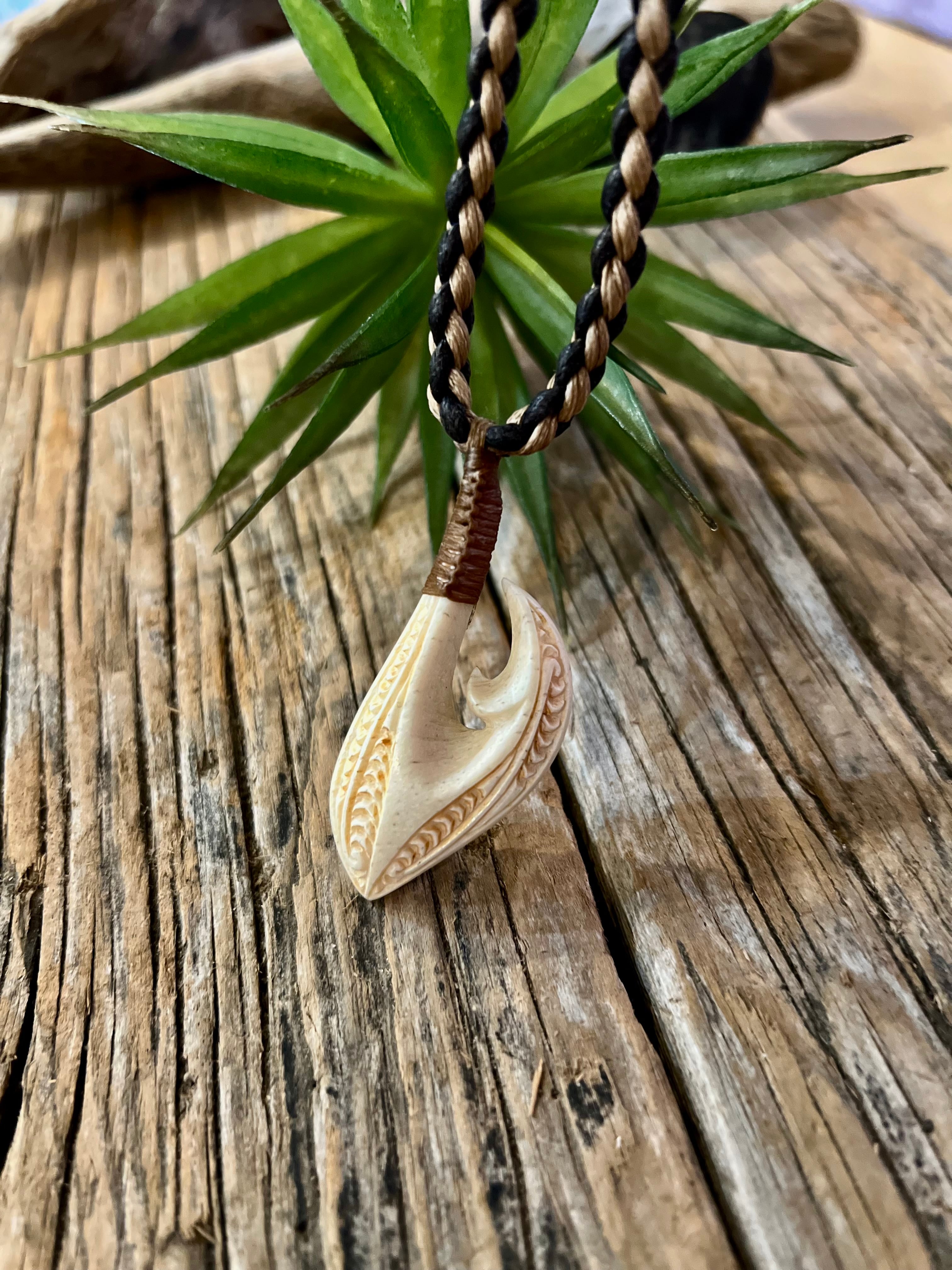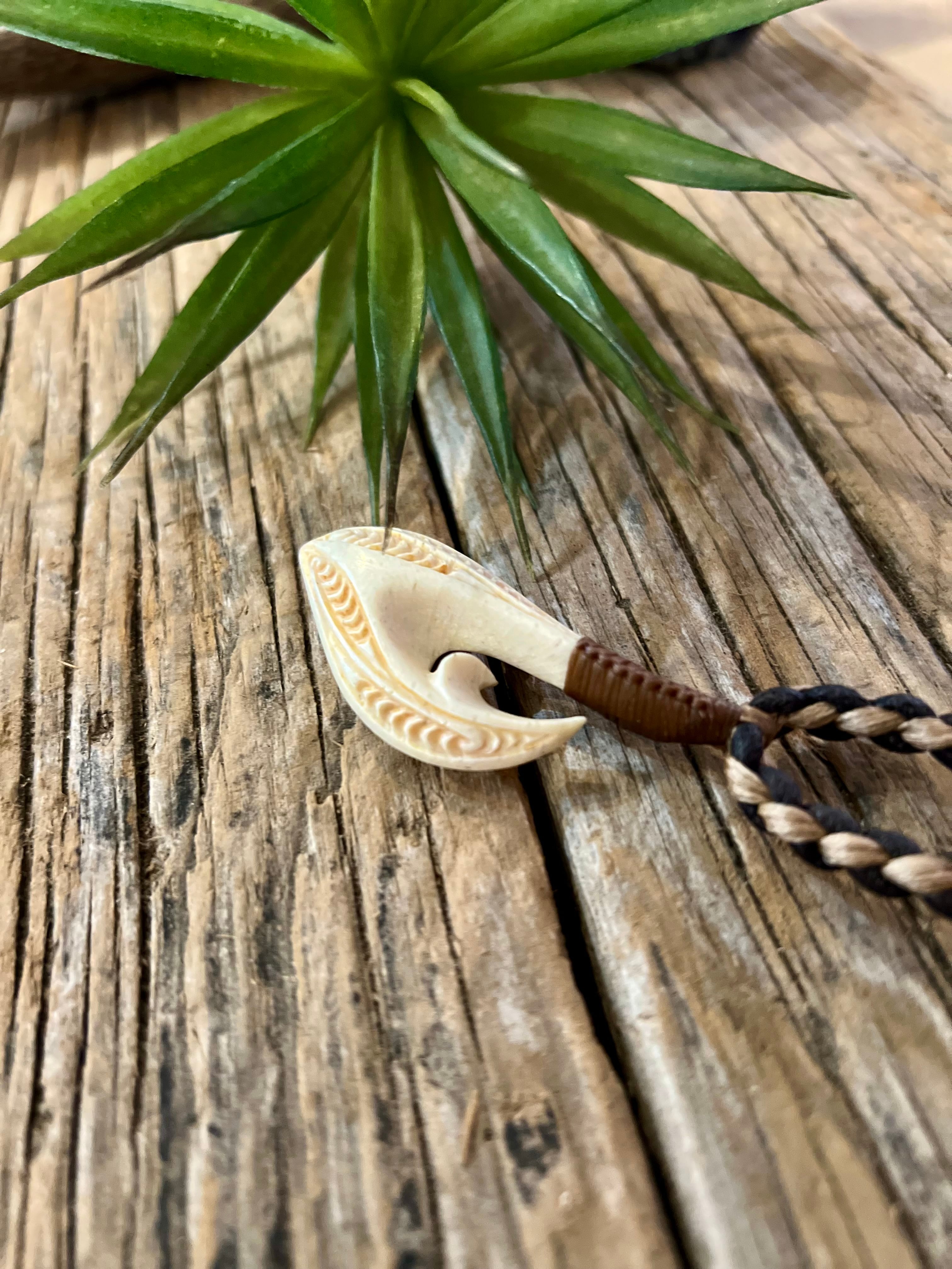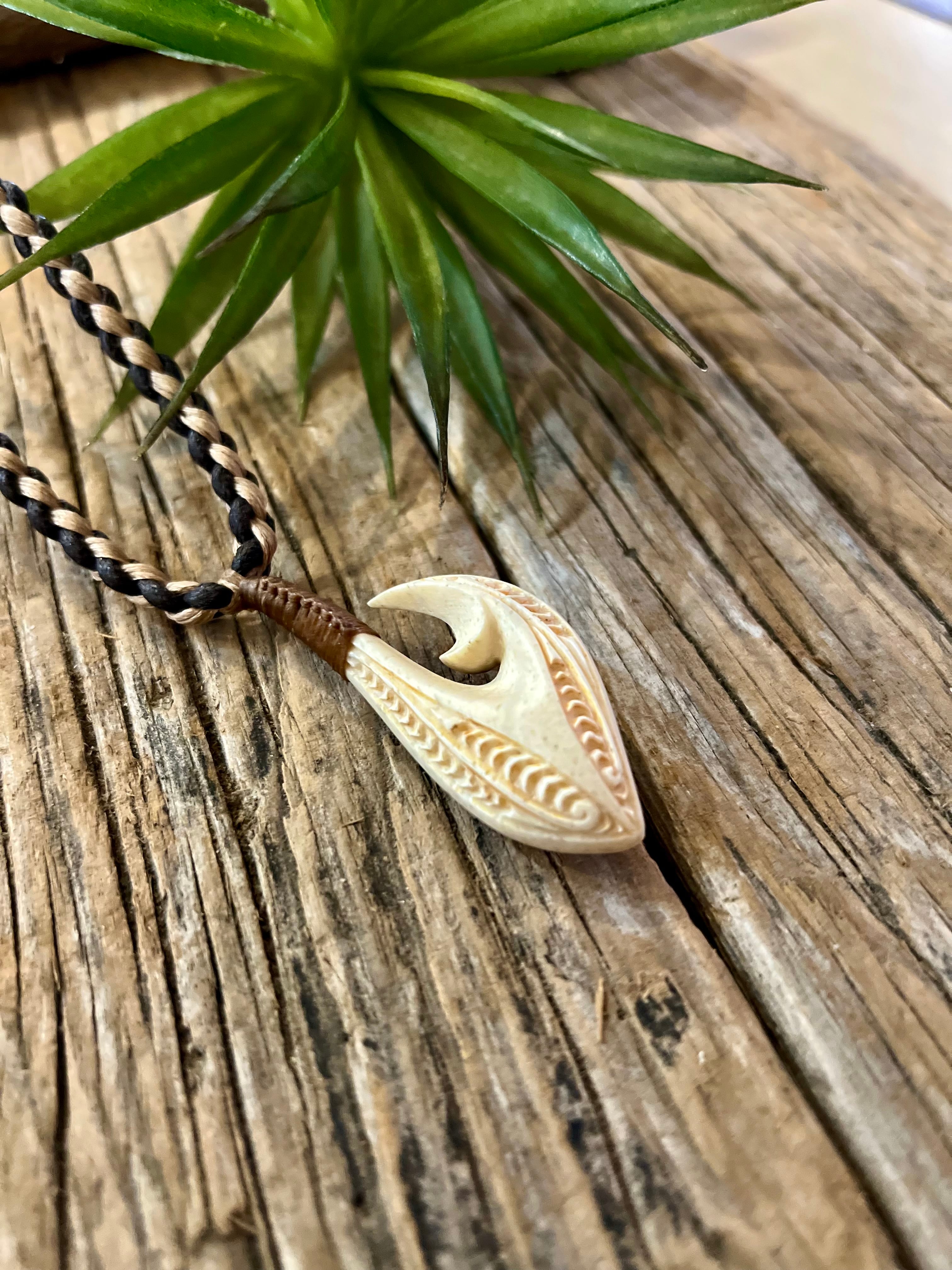 鯨骨らしい色合いと艶をいかしながらトライバルを彫り込んでます。