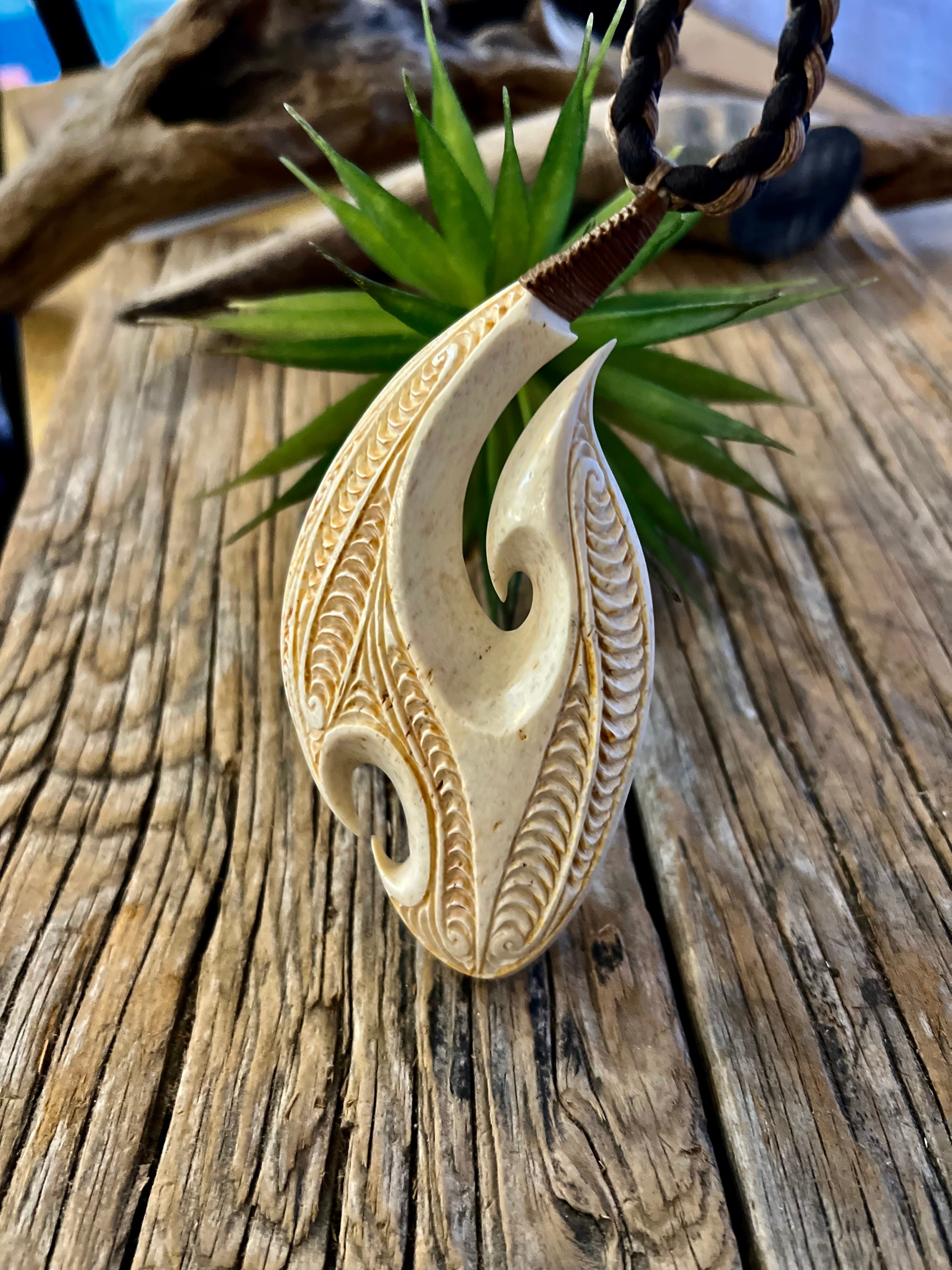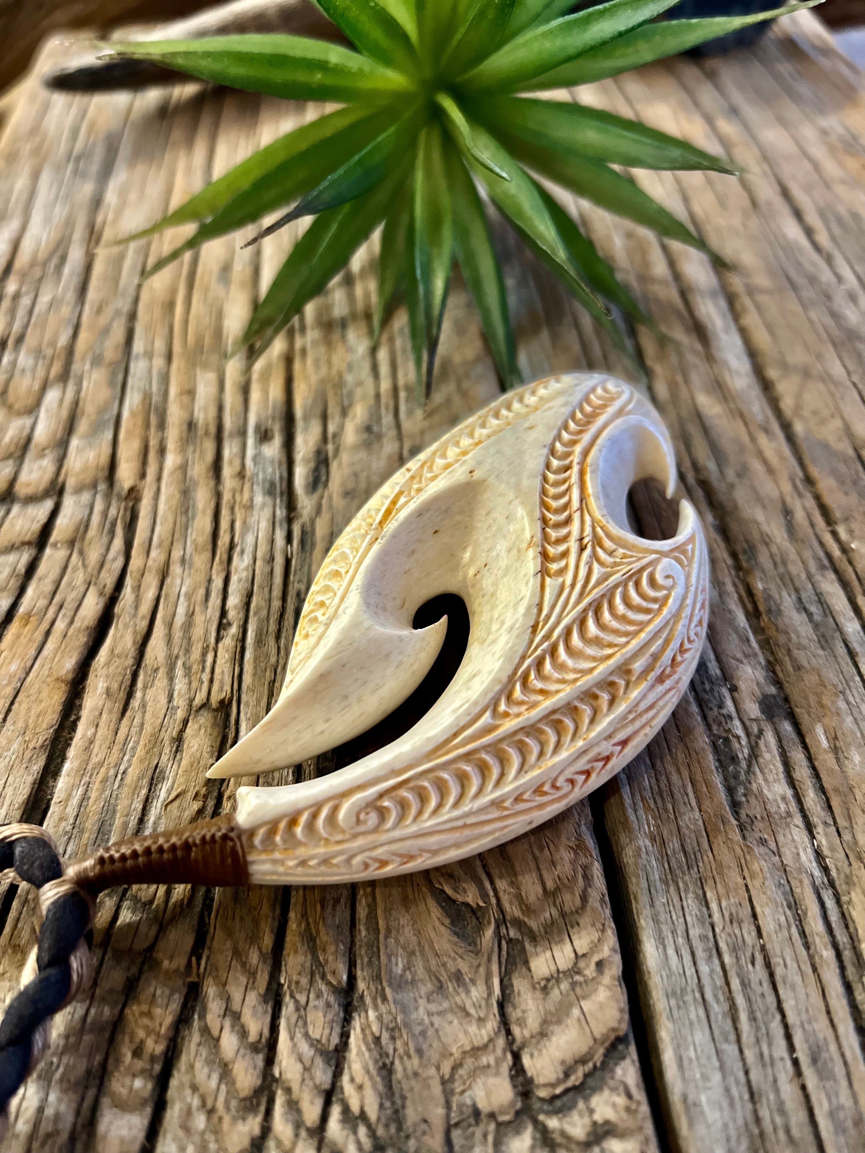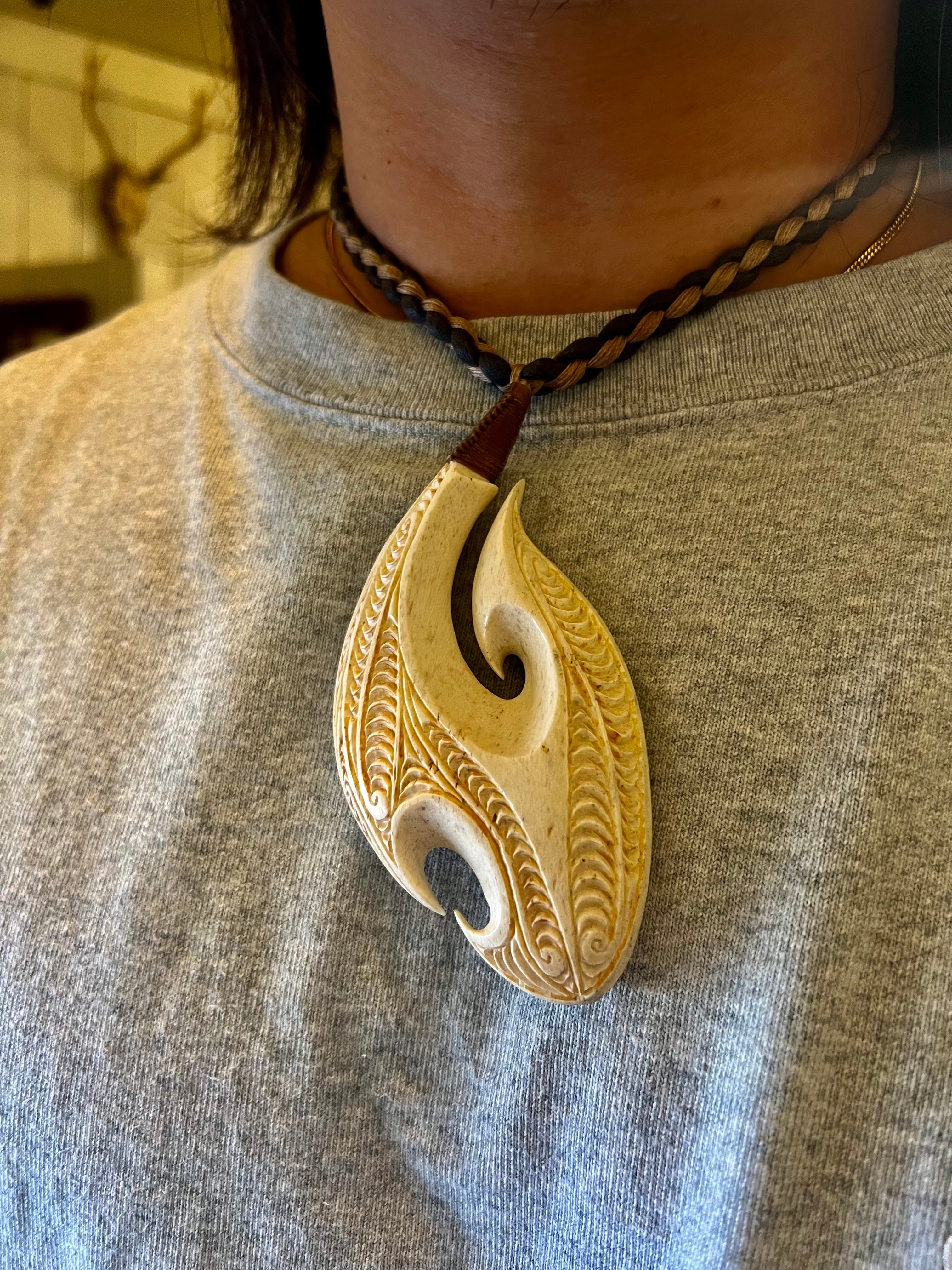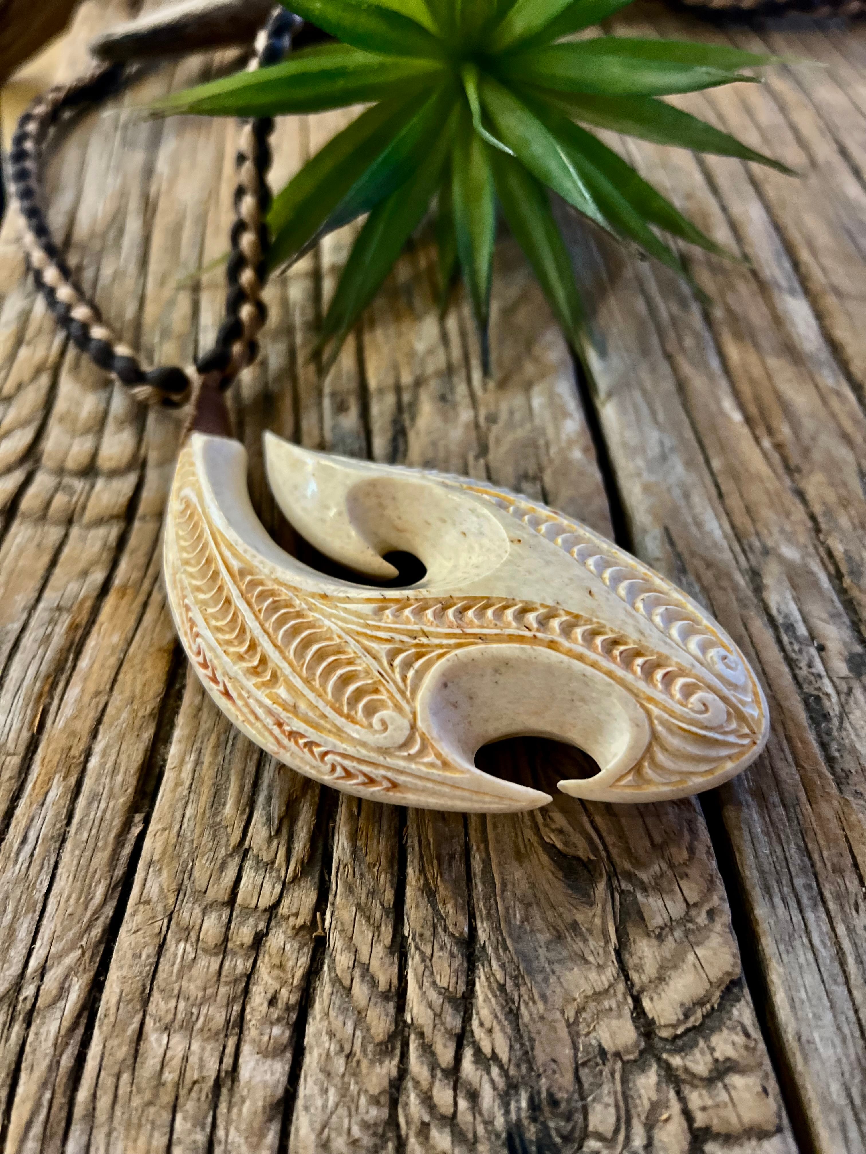マッコウクジラならではの独特な斑点と色合いを活かしながらトライバルを彫り込んであります。