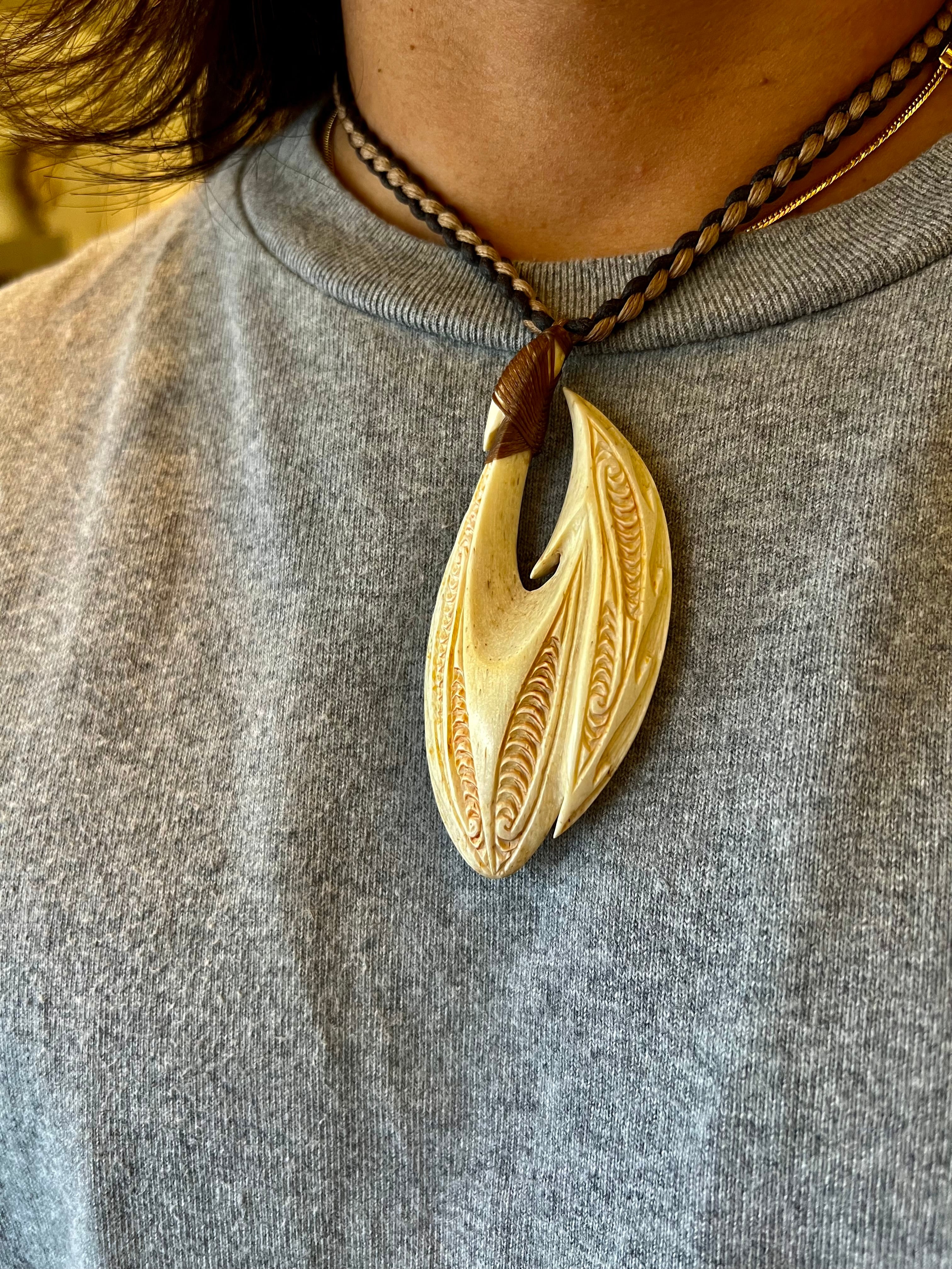 マッコウクジラならではの独特な斑点と色合いを活かしながらトライバルを彫り込みました。