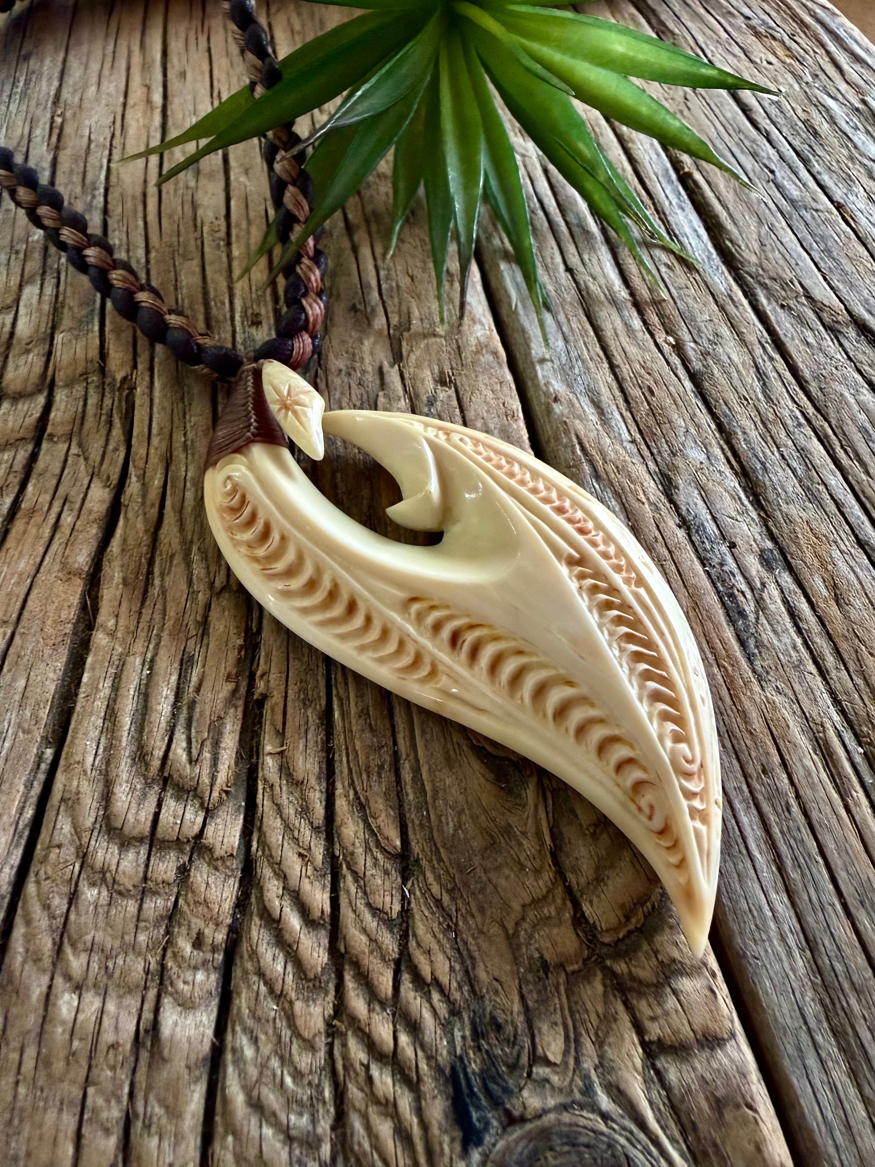 セイウチ牙特有の模様と艶をいかしながら、トライバルを彫り込んであります。